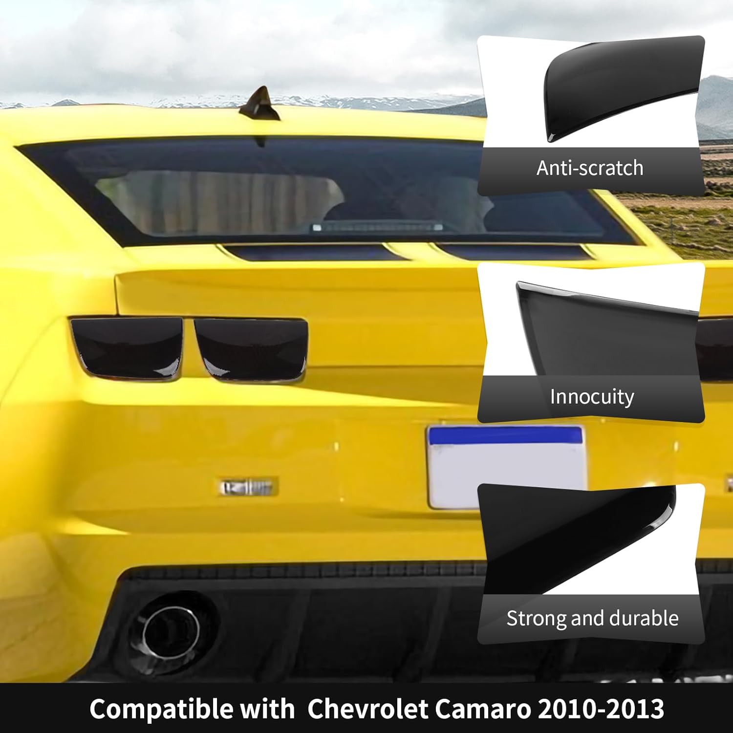 【Perfect Fitment】 Specifically designed for Chevrolet Camaro 2010–2013 models. Please verify compatibility with your vehicle before purchasing to ensure a perfect fit. 【Premium Quality Material】 Crafted from high-quality ABS plastic that is lightweight, colorfast, and durable. Designed for long-term use, providing excellent protection while maintaining a sleek appearance. 【Stylish & Functional Upgrade】 Enhances your vehicle’s rear-end look while protecting the taillights from scratches, debris, and minor impacts. The cover maintains excellent light transmission and does not affect taillight brightness or performance. 【Quick & Easy Installation】 Takes only minutes to install — simply peel and stick using the pre-applied double-sided tape on the back. No tools or modifications required. 【Worry-Free After-Sales Service】 We offer a 30-day free return and a 1-year warranty for your peace of mind. If you’re not 100% satisfied with your taillight covers, contact us anytime — we’ll provide a prompt and satisfactory solution.