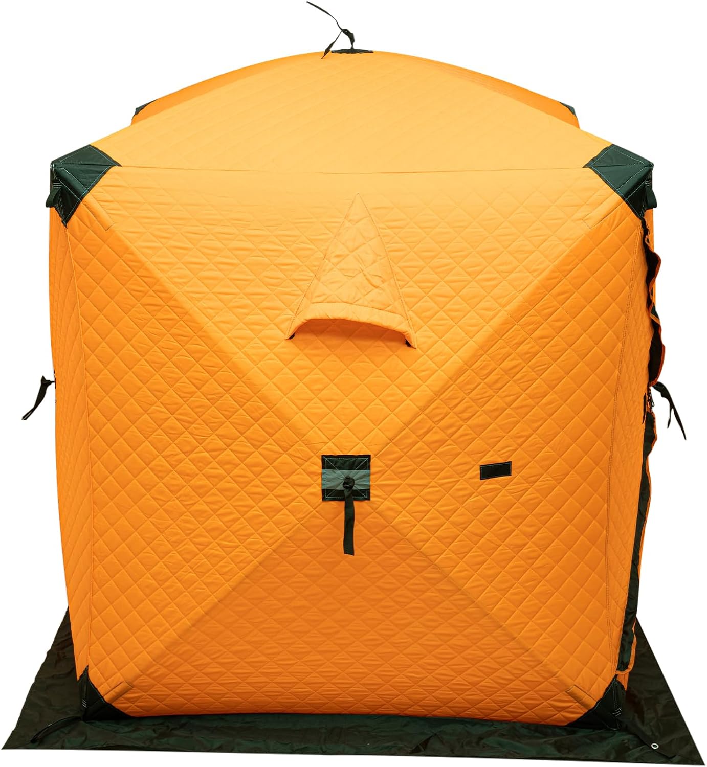 Details Ventilation Hole: It allows fresh air flow in the tent while it has a cover cloth to keep rain and leaves from entering.Reflective Strip: With the reflective strip, the tent becomes easily visible in low-light conditions.Built-in Storage Pocket: It enables you to conveniently place your cell phone, sticky notes, and other items.Cloth Strip: It keeps rain or cold wind from seeping through the tiny gaps, thus providing better resistance to the cold. ApplicationIt can be used in parks, backyards, snowfields, and grasslands for various purposes such as camping, hiking, fishing, surfing, outdoor adventure, family parties, and field trips.SpecificationsMaterial: 210D Oxford Cloth, FiberglassColor: OrangeShape: SquareSeasons: WinterSport: FishingClosure Type: ZipperMounting Type: StandingAssembly Required: YesCare Instructions: Hand-washCapacity: 1-2 PeopleGross Weight: 9.3 kg/20.5 lbsNet Weight: 9kg/19.84 lbsFiberglass Rod Diameter: 9.5mm/0.37 inExpanded Product Size: 145*145*165 cm/57.09*57.09*64.96 inPackage Size: 24*24*110 cm/9.45*9.45*43.31 inPackage Included1* Ice Fishing Tent4* Ice Anchors1 Bundle* Windproof Ropes1* Toolbag1* HandbagNotesPlease note that the product does not contain a backing cloth.Please keep the bottom from water. The product is not flame retardant, please keep it away from fire sources when using it.Please note that this product can only be hand-washed instead of machine-washed.