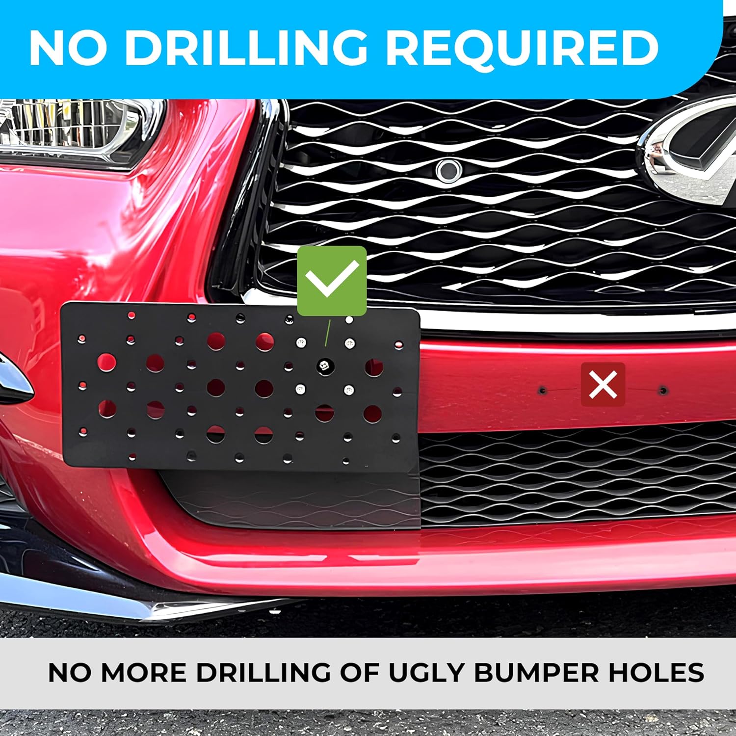 Front Bumper Tow Hook License Plate Mount Bracket for Infiniti Q50 2014-2026, Plate Holder Set w Unique Screw Bolts & Black Screw Caps, License Tag Mounting Kit, Quality Plate Holders.