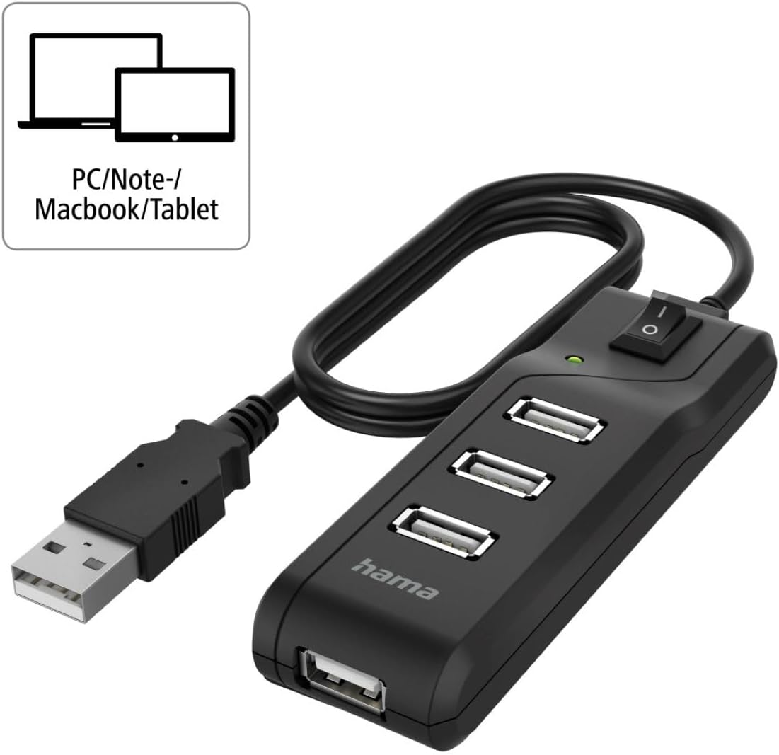 The Hama USB hub, 4 ports, 480 Mbps, one allows you to connect PC, notebook, MacBook, tablet to USB stick, mouse, keyboard or printer. High-speed data transfer reaches up to 480 Mbps. An on/off switch allows for energy-saving use of the devices and the LED function indicator gives information about the device status. The high-quality materials and workmanship ensure excellent transmission quality.