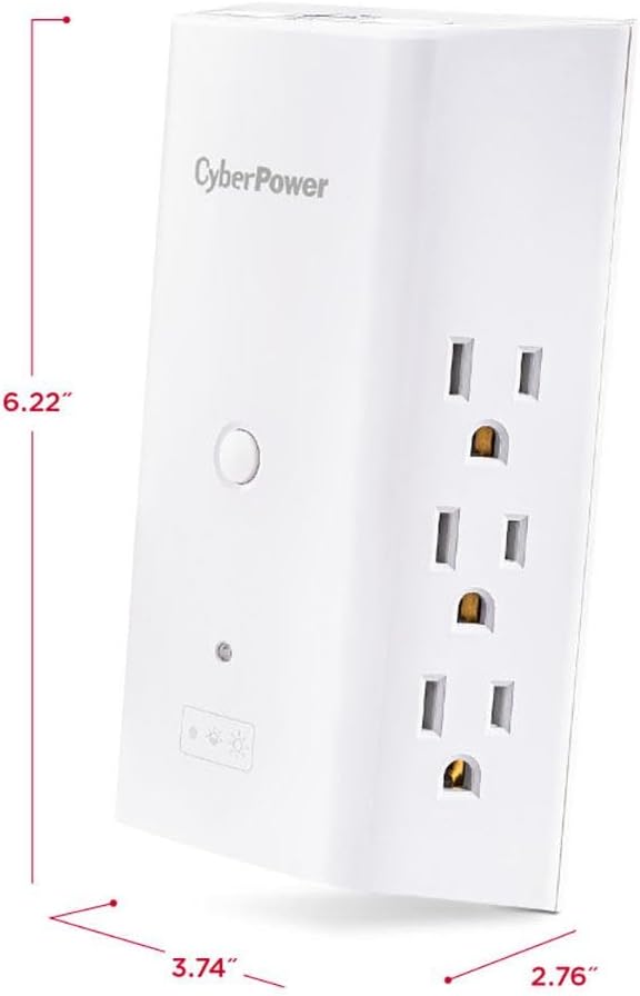 The CyberPower P6WUCL Wall-tap Surge Protector with USB charging safeguards common home and office devices, such as computers and electronics, by absorbing spikes in energy caused by storms and electrical power surges. It provides 900 joules of protection, has 6 surge-protected AC outlets, two USB-A ports with 2.4 Amps shared power output and one USB-C port rated at 18W PD to charge mobile, USB enabled devices. The CyberPower P6WUCL features a photo sensor activated light and an impact-resistant casing.Less ThanBrGreater ThanLess ThanBrGreater ThanLess ThanBGreater ThanFeaturesLess Than/BGreater ThanLess ThanBrGreater ThanLess ThanBrGreater ThanLess ThanBGreater ThanSurge ProtectionLess Than/BGreater ThanLess ThanBrGreater ThanDiverts excess voltage away from sensitive electronic equipment during an AC power surge or power spike to prevent damage.Less ThanBRGreater ThanLess ThanBrGreater ThanLess ThanBGreater ThanUSB Charge PortsLess Than/BGreater ThanLess ThanBrGreater ThanCharge and power USB enabled mobile devices such as tablets, phones, portable speakers, and more.Less ThanBrGreater ThanLess ThanBrGreater ThanLess ThanBGreater ThanPhoto Sensor Activated LightLess Than/BGreater ThanLess ThanBrGreater ThanDown facing light activates with motion sensing technology for illumination of dark environments. Multiple brightness settings, or can be turned off.Less ThanBRGreater ThanLess ThanBRGreater ThanLess ThanBGreater ThanEMI/RFI Noise FilterLess Than/BGreater ThanLess ThanBr