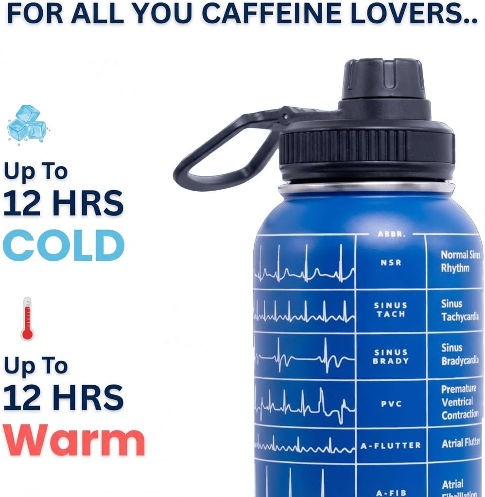 "Stay hydrated while keeping essential cardiac rhythms within easy view with this insulated 32 oz stainless steel water bottle. Featuring double-wall vacuum insulation, it helps maintain drink temperature for up to 12 hours hot or cold, making it ideal for class days, clinical rotations, long shifts, and everyday hydration needs. The bottle showcases 11 clearly engraved cardiac rhythms, including NSR, sinus tachycardia, sinus bradycardia, PVC, atrial flutter, STEMI, SVT, ventricular tachycardia, ventricular fibrillation, and asystole. These engraved EKG references provide a convenient visual review option during busy schedules without relying on separate study materials. Designed for EMTs and paramedic trainees, this travel water bottle supports coursework, clinical training, and exam preparation by keeping key rhythm patterns visible throughout the day. The reusable bottle is made from food-grade stainless steel with a durable powder-coated matte finish for a secure grip and long-lasting use. A wide-mouth opening allows for easy cleaning and ice filling, while precision engraving ensures lasting clarity. Built for learning on the go, this water bottle encourages daily rhythm recognition through consistent exposure during classes, ride-alongs or shifts."