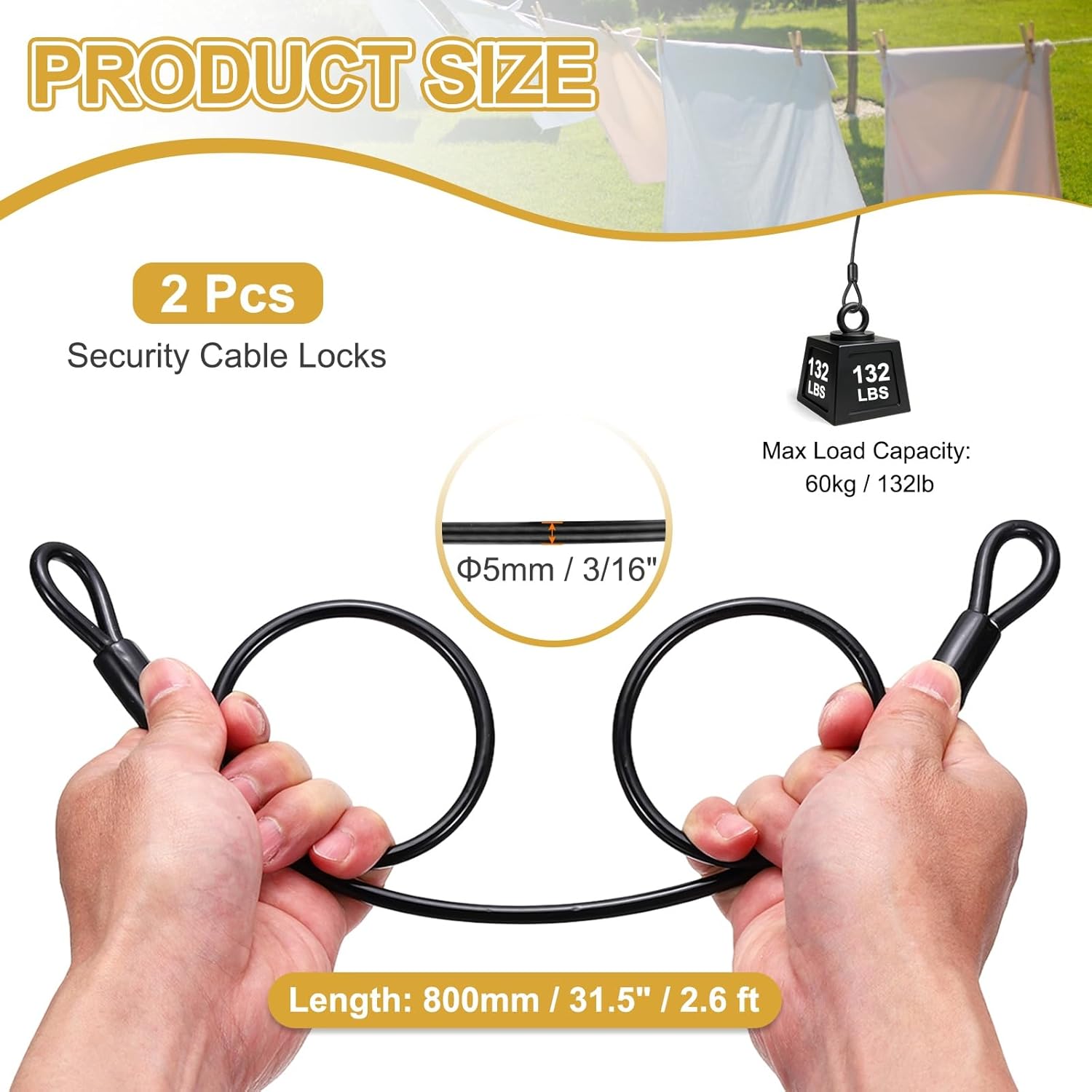 Reasons for selection:Locking cables use robust 7×7-strand stainless steel wires with high toughness, providing excellent corrosion and rust resistance; the wires are fully sealed in a smooth vinyl coating that avoids surface scratches on both the cable and contact surfaces, prevents accidental hand cuts, enhances waterproofing and long-term durability, and keeps the cables flexible for easy bending and twisting.Measurement:Length: 800mm / 31.5 inch / 2.6 ft; Wire Diameter: 5mm / 3/16 inch; Max Load Capacity: 60kg / 132lb; Color: Black; Material: Vinyl Coated Stainless Steel; Package: 2 Pcs x Security Cable LockSuitable for:Security steel cables serve as versatile locking accessories, suitable for securing luggage, bicycles, doors, and similar items. Travel security cable lock suitable for a wide range of lock types, including U-locks, padlocks, and disc locks. These steel cables are also commonly used in scenarios like garden setups, clothing adjustments, cord pulling, pet leashes, picture hanging, and railing installations.Installation:The outdoor travel safety cable adopts a double-loop design, with ring-shaped structures integrated at both ends and a spacious link space. Designed for travel scenarios, it fits compactly in backpacks or pockets for hassle-free portability. Double-loop structure is specifically optimized to work seamlessly with small combination locks and padlocks, meeting on-the-go security needs.Kind tips:Do not use for lifting or pulling heavy objects, use only for safety ropes and hanging lightweight.